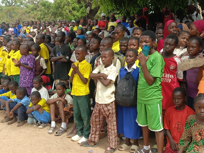 A large group of predominantly Black children, ranging from young to pre-teen ages, are gathered outdoors on dry, light brown earth in Akwanga, Nigeria