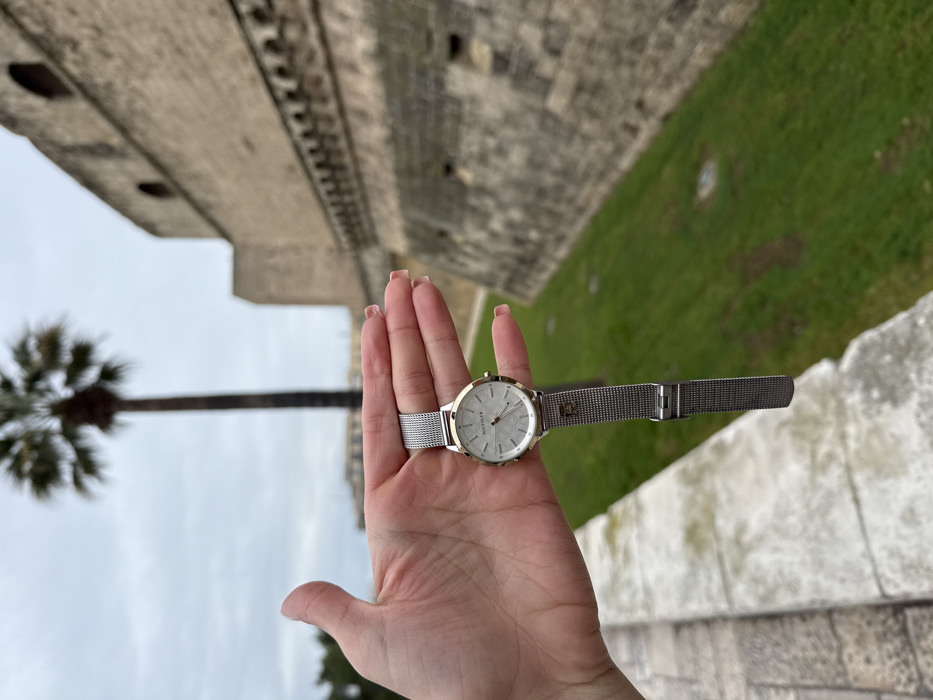 - "A fair-skinned human hand, with manicured fingernails, holds a silver-toned wristwatch featuring a gold bezel, a white textured dial with "HILFIGER" branding, and a mesh metal strap with a visible clasp" by FM-4ESV13, licensed under CC BY 4.0