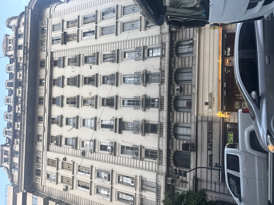 The image presents an upward-angled street-level view of an ornate, multi-story building in the city of Buenos Aires, Argentina