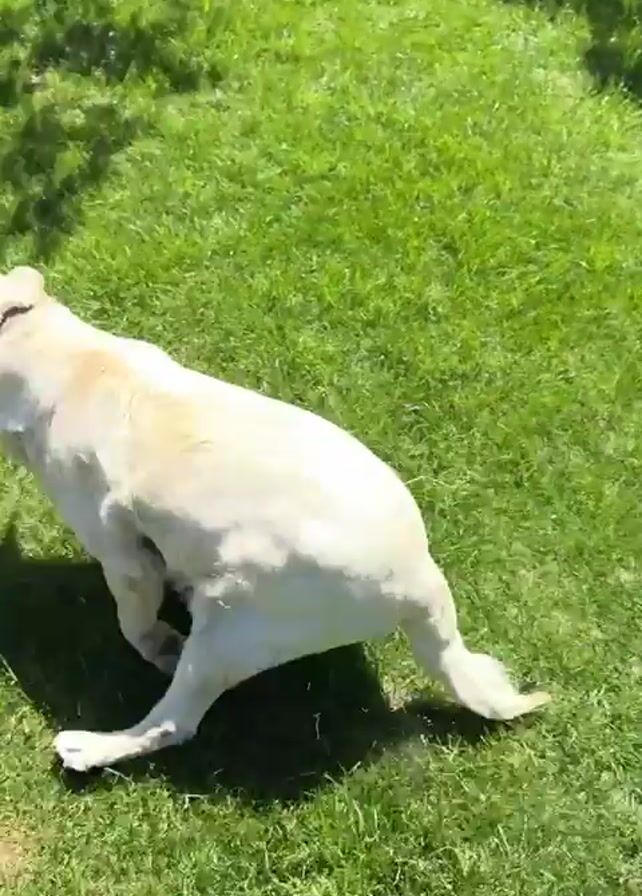 light-colored Labrador dog running around a grassy yard. The dog runs through the yard, sometimes under trees, and appears to be enjoying itself. The yard is green and well-maintained, and there is a house and some trees visible in the background. The weather appears to be sunny.