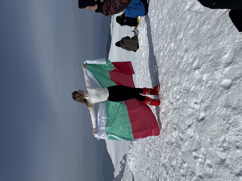 The scene depicts a snow-covered mountain landscape near the city of Bistritsa, Bulgaria, under a hazy, light blue sky. A female subject, with long light-colored hair, stands upright in the center-left, facing left. She is wearing a white long-sleeved turtleneck top, black leggings, and red "Moon Boot" brand winter boots. Her arms are extended horizontally, holding a Bulgarian flag (white, green, red horizontal stripes) taut behind her. To the right, in the mid-ground, three individuals are seated or crouched on the snow. One individual wears a dark olive jacket, another a dark top, and a third a blue jacket. A small Bulgarian flag is visible near the seated individuals. In the bottom-right foreground, a hand holding a black smartphone is visible, pointed towards the standing female, indicating photography or video recording. The ground throughout the image is covered in textured white snow with visible footprints. Distant snow-covered hills or mountains are visible under a hazy sky in the background.