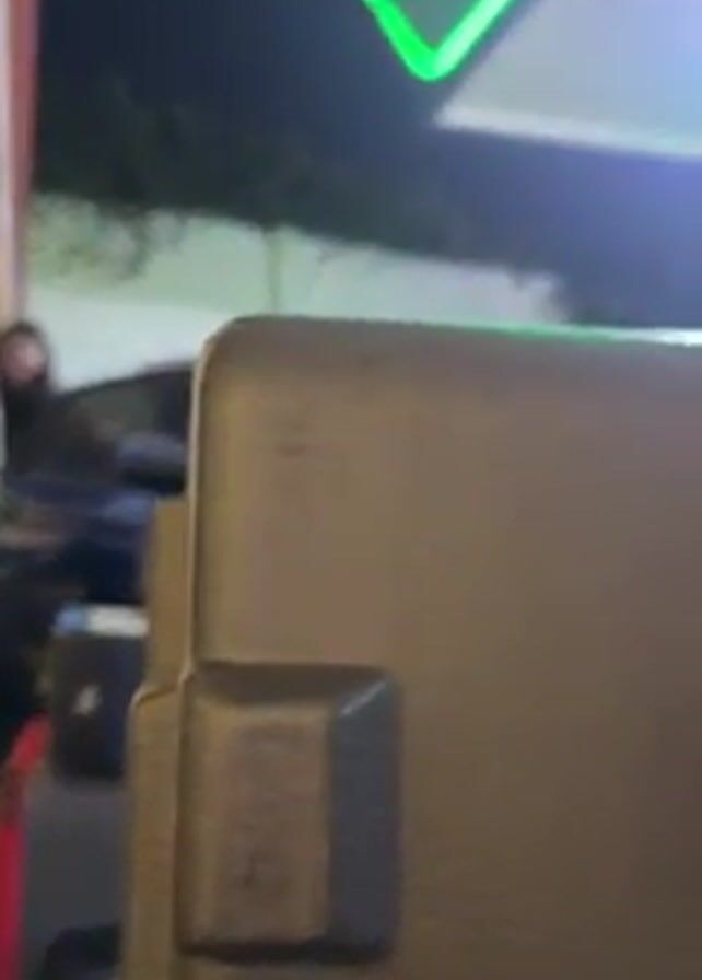 person standing next to a car at a PEMEX gas station at night. The gas station has green neon trim and bright lights. A gas pump is visible in the foreground.