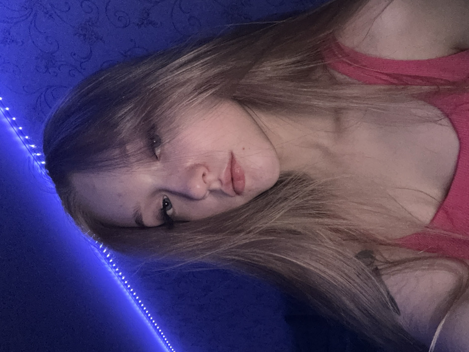 A close-up indoor photograph captures a young female. She is positioned centrally, looking directly into the camera, with her head and upper torso filling most of the frame. Her long, straight, light brown hair cascades over her shoulders, framing her face, which features light eyes and full, slightly parted lips. She wears a bright pink sleeveless top. A dark, indistinct tattoo is visible on her left shoulder. The background consists of a dark wall, possibly adorned with a subtle pattern visible under the ambient light. The scene is illuminated primarily by a string of blue LED lights positioned horizontally across the upper left of the frame, casting a strong blue light throughout the environment. The setting is an indoor room; no specific geographical markers are visible to confirm the location in the city of Saratov, Russia.