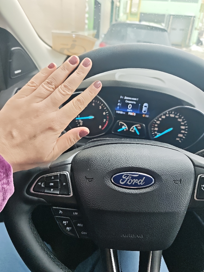 The image presents a first-person perspective from the driver's seat of a Ford vehicle, identified as being in Dmitrov, Russia. A left hand, featuring reddish-brown manicured nails, rests on the upper-left portion of the black, leather-wrapped steering wheel. The hand is attached to an arm wearing a purple sleeve, and a blue fabric, consistent with jeans, is visible on the lap. The steering wheel prominently displays a blue oval Ford emblem in its center and includes multi-function controls on both sides, with "AIRBAG" inscribed at the bottom. Through the steering wheel, the instrument cluster is partially visible, showing a digital display. The display indicates the vehicle is in "D" (Drive) mode, the speed is "0", and the odometer reads "118180 km". Analog gauges with blue needles flank the digital display. Through the vehicle's windshield, the rear of a dark-colored vehicle is visible directly ahead. Beyond this vehicle, a light green building structure with white architectural elements is present. A brown sign or object, partially obscured, featuring a symbol resembling a disabled access icon, is also visible through the upper-left area of the windshield.