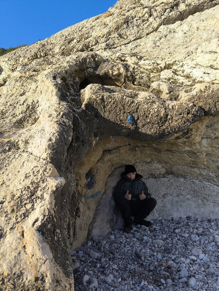 The scene is located at a natural rock formation in Mirište, Montenegro. A pale, stratified rock cliff rises vertically, terminating against a clear blue sky. At its base, a shallow rock shelter has formed, with its floor covered in small, grey and white pebbles and gravel. Inside this shelter, one person, appearing to be a young male, is in a low crouch. He is dressed in a dark beanie, a dark grey padded winter jacket, dark trousers, and dark footwear. Both of his hands are raised, each displaying a "thumbs-up" gesture. Blue spray paint markings are visible on the interior rock wall to the person's left. An irregular, dark blue object is affixed to the rock surface approximately one meter above the shelter's entrance.