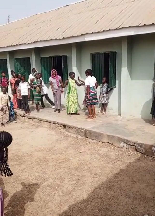 A group of about 20 people, adults and children, are outside a light-colored, one-story building with green trim around the windows. Most of the group is watching three women dance on a concrete walkway in front of the building. The women appear to be in their 30s or 40s. One woman is wearing a green and yellow dress, another a white shirt and patterned skirt, and the third is wearing gray leggings and a pink headscarf. The dancers are smiling and moving to music, which is audible but indistinct. The children watching are dressed in everyday clothes, and some of the adults are also casually dressed while others are in more formal attire. The ground is dirt, and the sky is overcast. The setting seems to be a schoolyard or community center.