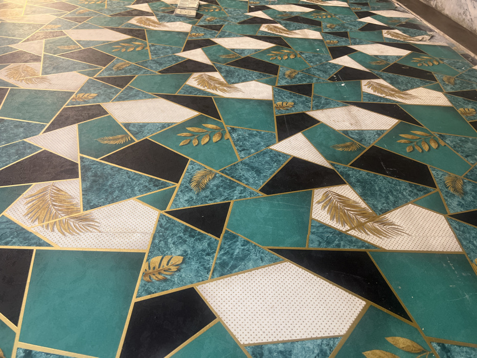 A wall, located in the city of Koliya, Pakistan, is covered with a geometric design featuring an array of irregular polygonal panels outlined by thin gold-colored lines