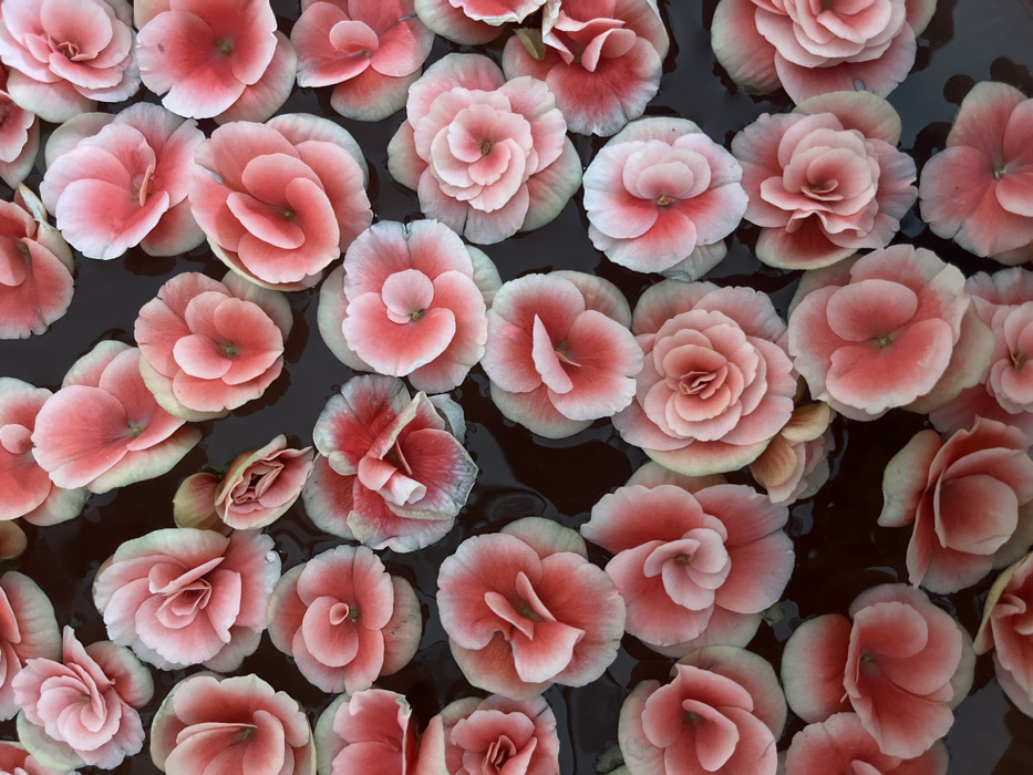 The image displays a high-angle, close-up view of numerous detached, pink and coral-colored flowers floating on a dark, reflective liquid surface. The flowers, resembling begonia blossoms, exhibit multiple layers of petals, ranging in hue from soft pink to vibrant coral, with some showing lighter, almost white or pale green edges. Several blooms feature tightly clustered central petals, while others are more open. The flowers are densely packed, covering the majority of the dark, possibly brown or black, liquid surface, which shows minor reflections and undulations. No people or additional objects are present in the scene. This scene is located in Mexico City, Mexico.
