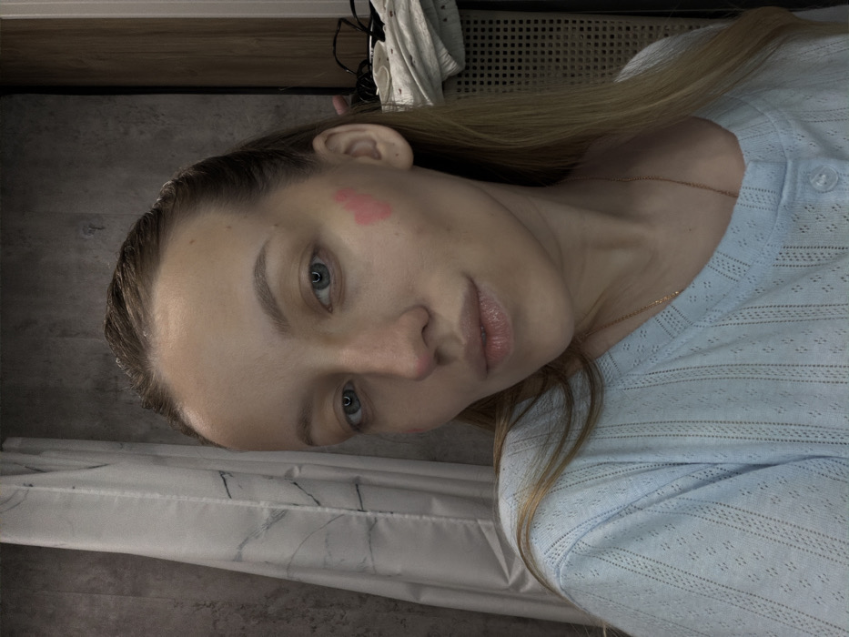A fair-skinned female, appearing to be in her 20s or early 30s, is depicted in a head-and-shoulders portrait, looking directly at the camera. Her hair, light brown or blonde, is styled partially pulled back. She has light blue eyes, and her lips are slightly parted with a glossy finish. A distinct pink, heart-shaped mark is present on her left cheekbone. She wears a light blue, V-neck top with a delicate open-work pattern and a visible gold-colored chain around her neck. The background indicates an indoor setting. To the left, a white shower curtain with a grey marbled pattern is partially visible against a dark grey wall. To the right, a darker, textured wall or paneling is present, behind which an open storage unit containing folded white textiles and dark cables is discernible. The specific city of Reshetnikovo, Russia, cannot be confirmed from the visual information provided within the image.