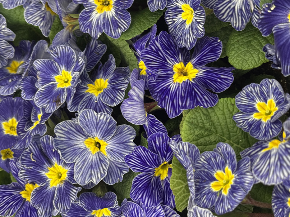 The image displays a dense, close-up view of numerous blooming flowers, filling the entire frame. The flowers are characterized by five-lobed petals exhibiting a variegated pattern of deep violet-blue and lighter blue or white radial stripes, emanating from the center of each bloom. Each flower's core features a prominent, bright yellow pistil and stamens. Interspersed among the floral clusters are dark green, textured leaves with distinct venation. No people, objects other than the plants, or actions are depicted. The scene suggests a horticultural environment such as a garden bed, planter, or nursery display. The specific location within the city of Tbilisi, Georgia, cannot be determined from the visual information provided in this macro-level image, which lacks any identifying geographical or urban markers.
