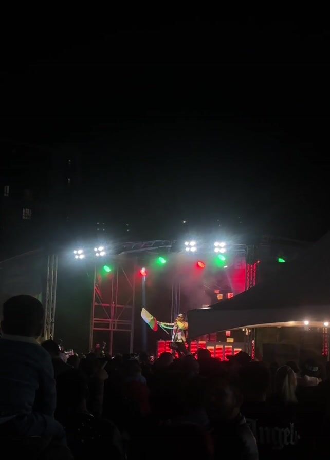 At night, under the illumination of stage lights, a performer holds a flag with green, white, and red vertical stripes in front of a crowd. The stage features an LED wall. The crowd is composed of many people, including a child sitting on someone’s shoulders.
