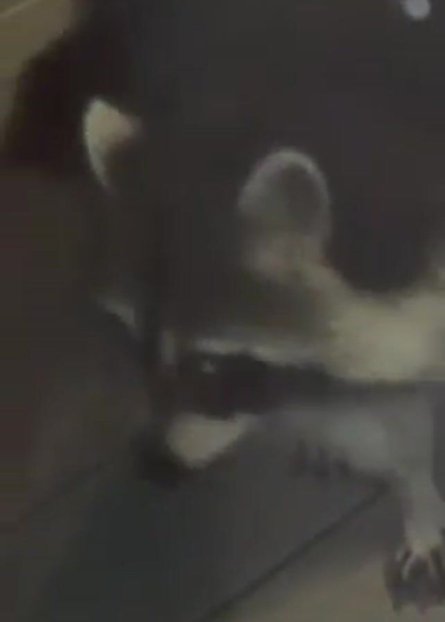 raccoon on a wooden deck. The raccoon is gray and black with a white face. Its eyes reflect the light and appear to be glowing. The raccoon walks around on the deck. There are indistinct sounds of people talking in the background.