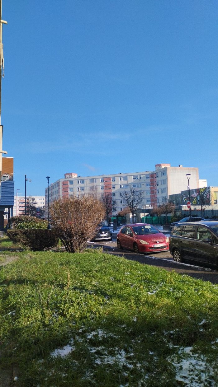 The image captures an urban street scene in Schiltigheim, France, under a clear, bright blue sky. The foreground consists of a grassy area featuring scattered patches of snow, indicating cold weather. A prominent, bare deciduous bush with brown branches stands in the lower-center, with a smaller, trimmed green shrub to its left. In the midground, a paved road curves gently to the right. Three passenger vehicles are parked along the right side of this road, facing towards the right: a dark-colored hatchback, a red Peugeot 207 hatchback displaying a French license plate partially legible as "BJ-101-GN", and a dark grey or black station wagon/SUV whose front is cut off by the frame. Two tall, black streetlight poles are visible, along with a red circular "No Entry" sign to the right of the central streetlight. The background is dominated by a large, multi-story residential building with a light-colored facade and distinctive reddish-orange horizontal accents. Bare deciduous trees are sparsely distributed between the road and the buildings. To the far right, a colorful mural is visible on a wall behind a fence. A portion of another light-colored building with a blue section is visible on the far left edge of the frame. No individuals are present, and no active interactions are depicted. The scene is brightly illuminated by natural sunlight.