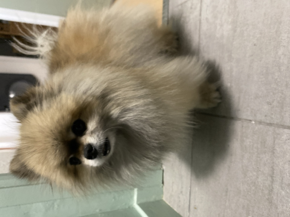 A light fawn and cream Pomeranian dog with dark eyes and a black nose stands indoors on a tiled floor in Lille, France