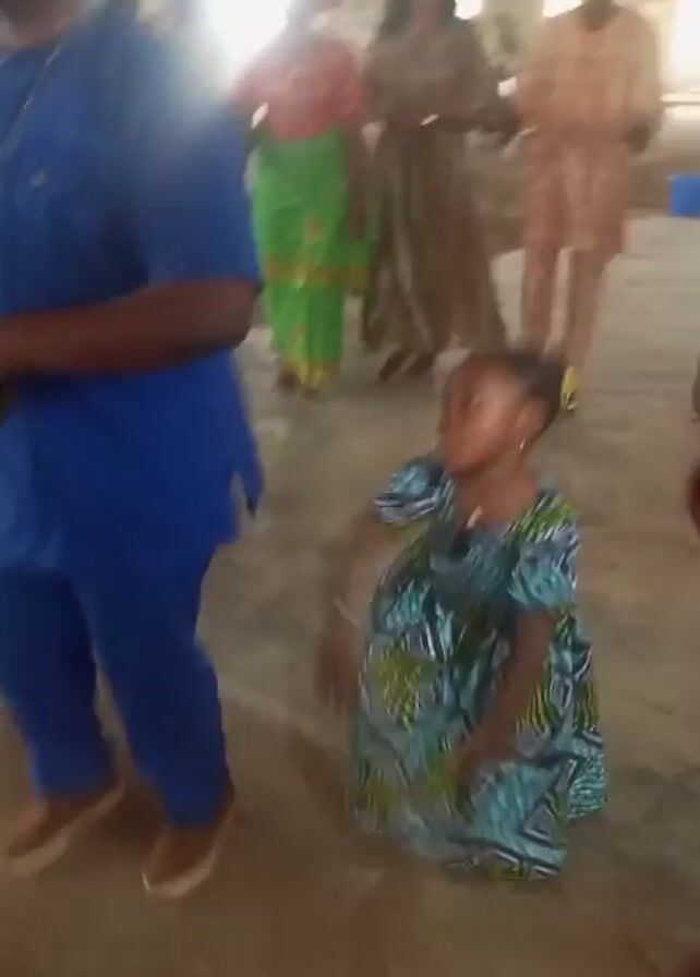 A young girl in a blue and green print dress dances in the center of a room, facing the camera. Other people dance in the background, including a man in a blue suit who dances at the beginning of the video. Some of the people in the background wear traditional African clothing. The room appears to be a community hall or church. The lighting is bright but slightly washed out.