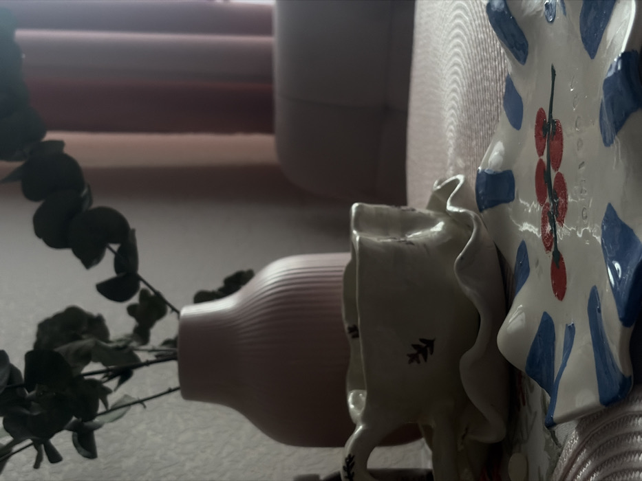 The image displays an indoor domestic scene in Novosaratovka, Russia, featuring various ceramic items arranged on a table. In the immediate foreground, a white, wavy-edged ceramic dish with blue irregular patches and a central painted motif of red berries on a green stem is present. Slightly behind and to the left of this dish, a light-colored ceramic teacup with a handle and a matching wavy saucer rests on a circular, woven placemat. The teacup features small, dark, stylized leaf patterns. Further back, on the left side of the frame, a ribbed, light pink ceramic vase contains several branches of green eucalyptus-like foliage. The background consists of vertically striped pink or peach curtains to the right, behind which a blurred light-colored object, possibly the back of a chair or sofa, is discernible. The overall lighting suggests ambient natural light, creating soft shadows. No individuals are depicted, and no active interactions are occurring.