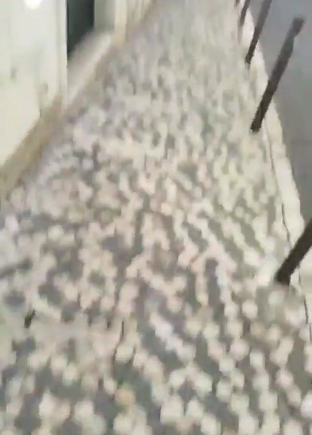 person walking on a black-and-white checkered-patterned cobblestone pavement in a narrow street in Lisbon, Portugal