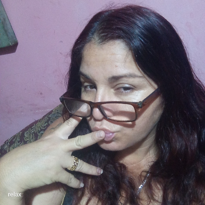 A woman with long, dark hair wearing glasses is captured in a selfie. She has her finger near her lips, and a gold ring is visible on her finger. She looks directly at the camera with a somewhat playful expression. The background is a pale pink wall, and there's a hint of a patterned couch or chair in the corner. A silver necklace is visible, tucked into her top. The word "relax" is written in white at the bottom left corner of the image.