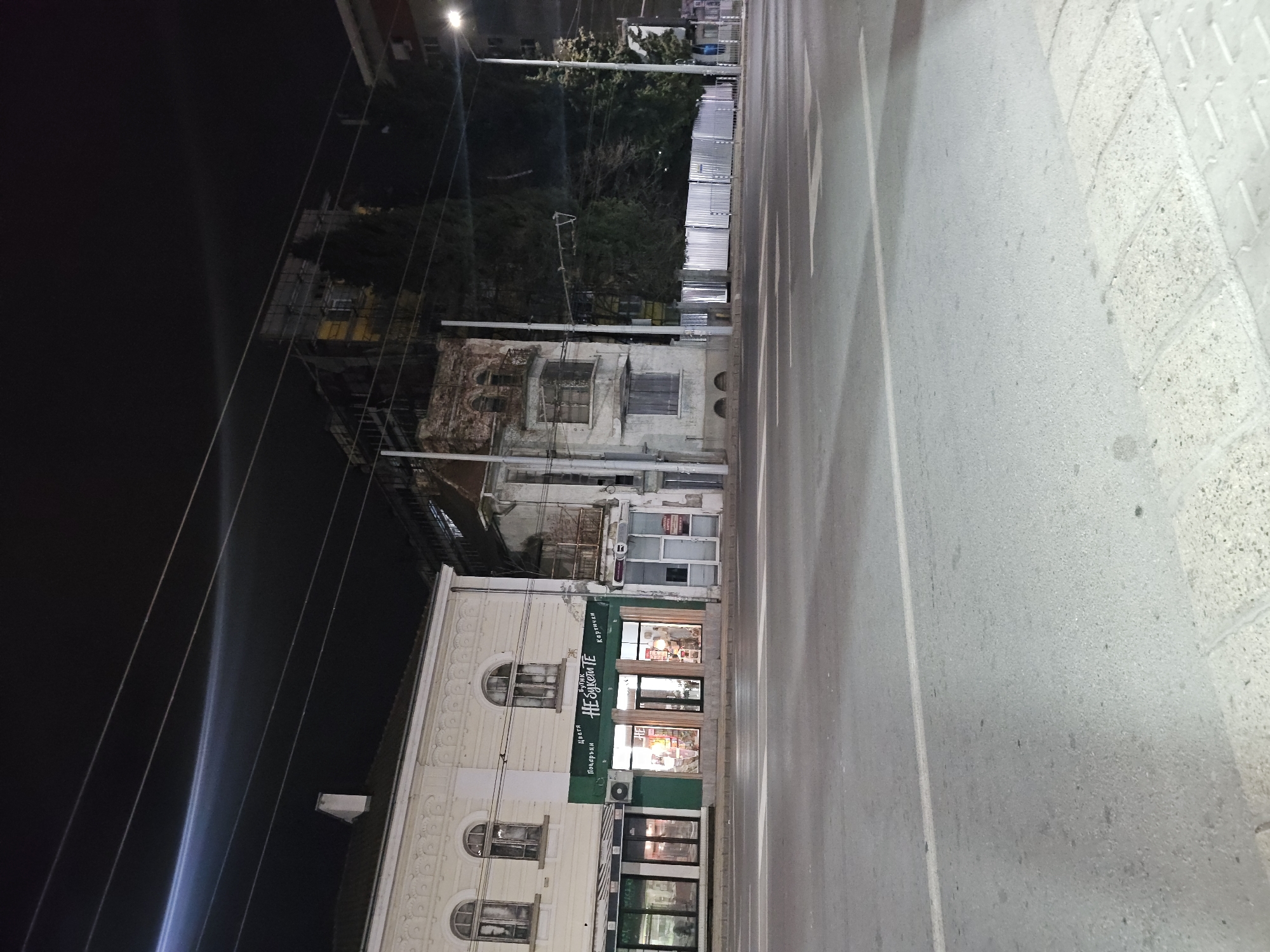 An urban nighttime street scene in Stara Zagora, Bulgaria, specifically at or near бул. "Митрополит Методий Кусев" 32, is depicted from a low vantage point looking towards a row of buildings. The foreground features an asphalt road with visible white lane markings and a textured concrete sidewalk section on the right. No people or vehicles are present. On the left, a light-colored, multi-story building with arched windows on its upper floor has a ground-floor commercial unit. This unit features a prominent green facade with Cyrillic text reading "Цветя" (Flowers), "Подаръци" (Gifts), "НЕбукетите" (THE bouquets / NOT the bouquets), and "Картички" (Cards), indicating a flower and gift shop. Its interior is illuminated, and an external air conditioning unit is mounted above the left window. Adjacent to this, a narrower, lighter-colored storefront with a glass door and awning is visible. Overhead, multiple parallel utility lines traverse the dark night sky, one exhibiting a prominent streak of light reflection. To the right of the first building stands a significantly older and partially dilapidated multi-story building, characterized by exposed brickwork, crumbling plaster, boarded-up or broken windows, and a visible metal balcony railing on an upper floor. Further right, a silver corrugated metal fence secures an area behind which dark trees and a taller, darker building, possibly under renovation with scaffolding, are discernible. The scene is illuminated by streetlights, with a bright light source visible on the far right. Multiple white vertical poles, likely supporting streetlights or utilities, punctuate the scene.
