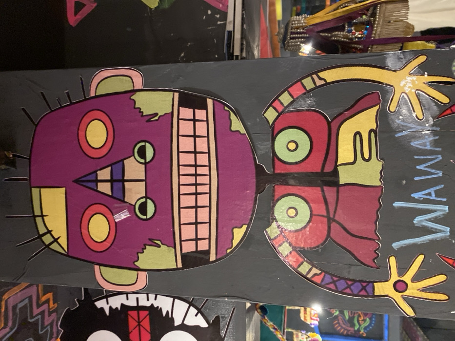 This image depicts a colorful, stylized humanoid figure mounted on a dark, vertically oriented surface, likely a skateboard deck, observed within a display area in El Alto, Bolivia. The central subject is a cutout artwork featuring an anthropomorphic character with a disproportionately large head and slender body. The head is primarily purple with light green and yellow patches, featuring two large yellow oval eyes with red outlines, a segmented triangular nose, and small green circular pupils positioned below the nose. Light green ear-like appendages extend from the sides, and a series of black lines suggests hair or spikes on top. A wide, rectangular mouth with numerous light pink teeth is prominently displayed. The torso is segmented, appearing dark red on the left and light green/yellow on the right, with two red-outlined green circular nipples. Stylized arms with multi-colored striped patterns (purple, red, green, yellow) extend outwards, terminating in yellow four-fingered hands with a red-outlined yellow circle in the palm. Below the figure, the word "WAWAV" is written in light blue/white script. To the left, a partial view of another artwork on a dark background reveals a black figure with white eyes and a red mouth. To the right, a decorative item, possibly part of a traditional garment or headpiece, made of purple fabric adorned with gold tassels, colorful beads, and yellow ribbons, is visible and appears illuminated. The overall environment suggests an indoor setting, possibly an art shop, market stall, or gallery display. No people are visible, and no active interactions or actions are depicted.