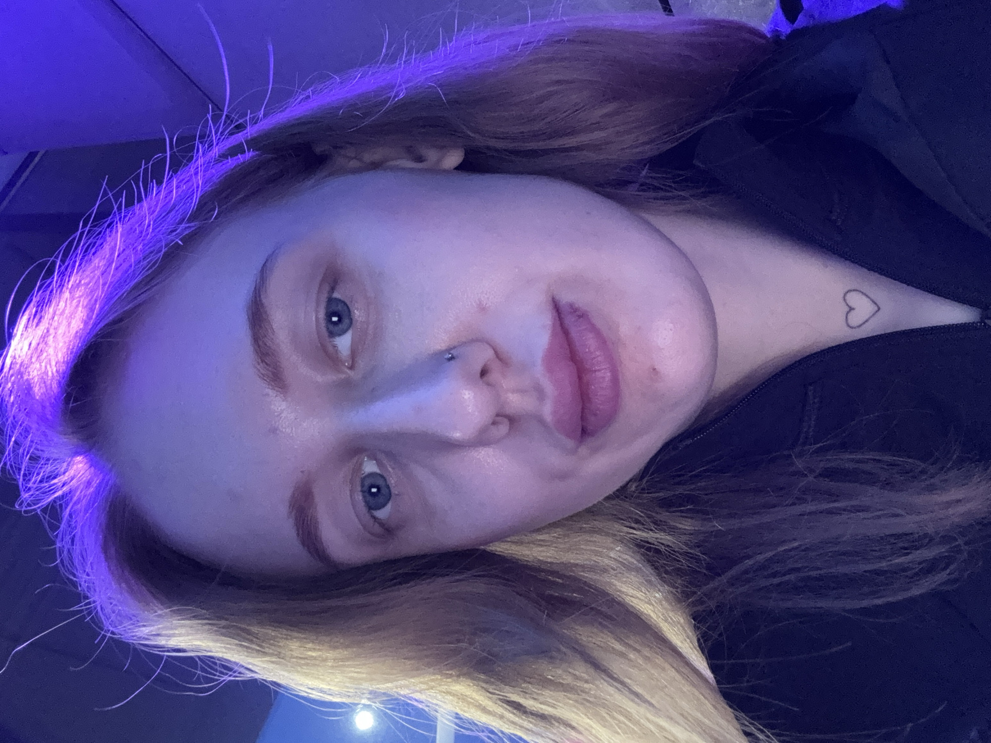 A close-up, tilted selfie of a fair-skinned person with light blonde hair, illuminated by a purplish-blue light source