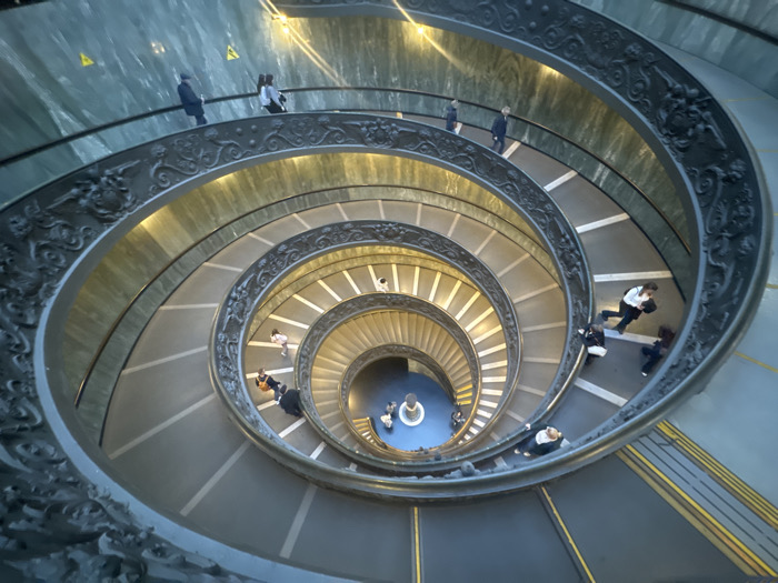 A spiral staircase curves dramatically, viewed from above