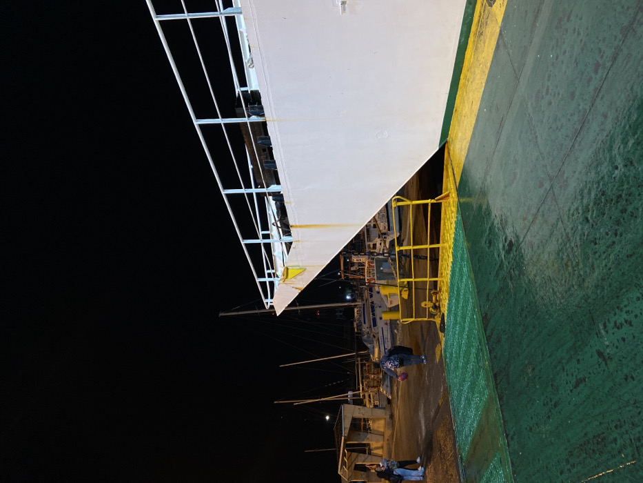 The scene depicts a nighttime view at a port in Punta de Piedras, Venezuela. In the foreground, the green and yellow painted deck of a large vessel, likely a ferry, is visible and appears wet. The deck features a textured surface and yellow demarcation lines. To the right, the white hull of the same vessel rises, displaying rust stains and a light blue metal railing along its upper edge. A yellow metal railing system, possibly part of a gangway or ramp, is positioned at the interface between the vessel and the dock. On the concrete pier to the left, a person is observed walking away from the camera, carrying a dark bag over one shoulder. Further back on the pier, two additional individuals stand near a light-colored concrete shelter or awning with a dark roof. In the background, beyond the pier, several masts of sailboats and other moored vessels are discernible under artificial lighting, illuminating the immediate area while the sky remains dark. The overall environment suggests active maritime operations during evening hours.