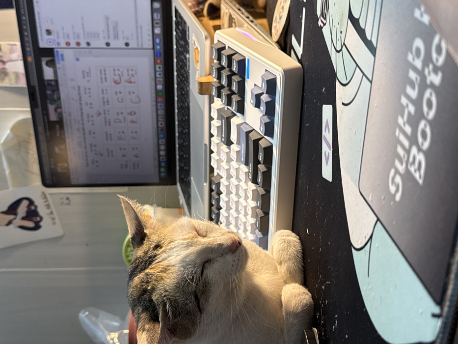 An indoor desk scene is depicted, situated in what is assumed to be a personal workspace in Thủ Đức, Vietnam; the specific location within Thủ Đức is not discernable. The primary subject is a domestic cat, exhibiting white, calico, and tabby markings, positioned on the left side of a dark desk surface. The cat is resting with its eyes closed, bathed in direct sunlight that illuminates its face and front paws, which are tucked beneath its body. To the cat's right, a mechanical keyboard with white and dark-colored keycaps is present. Behind the keyboard, a silver-colored laptop (appearing to be a MacBook Pro) is open, displaying an active screen. The laptop screen shows a document or application with visible musical notation or chord symbols (e.g., "F," "Ebm," "C7") and a partial chat or secondary window on the right. The laptop is slightly elevated, supported by a small wooden stand visible behind the keyboard. The desk surface beneath the cat and keyboard is covered by a dark mousepad featuring a light blue graphic outline of a character. A small rectangular object with a purple code tag icon (`</>`) rests on the mousepad near the center, and a larger rectangular object with partially visible text "SuiHub Boo" (likely "Bootcamp") is at the bottom right. The background consists of a plain light-colored wall. A small piece of paper or sticker with an illustrated hand pointing is affixed to the wall behind the laptop. Strong, natural sunlight is cast across the desk from an unseen window, creating bright illumination on the cat and parts of the desk. No human subjects are present in the image.