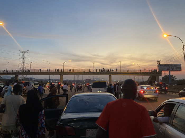 The image depicts a congested urban road scene during dusk within the Abuja metropolitan area, Nigeria