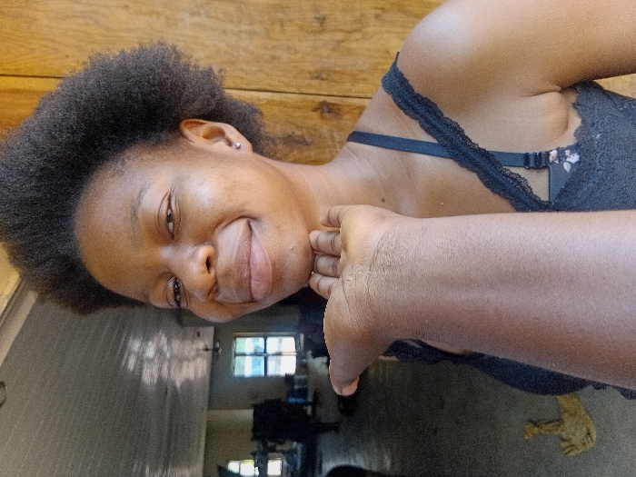 - "A young adult female with dark skin and short, dark, kinky hair is depicted in an indoor setting in Ejule, Nigeria" by FM-dBOlu2, licensed under CC BY 4.0