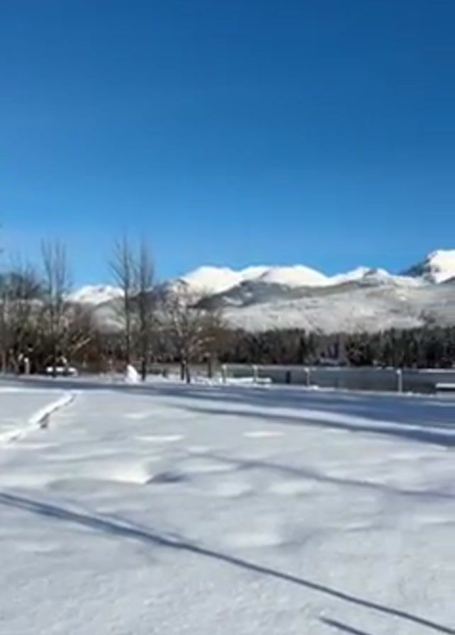 The camera slowly pans across a landscape blanketed in snow, under a bright blue sky