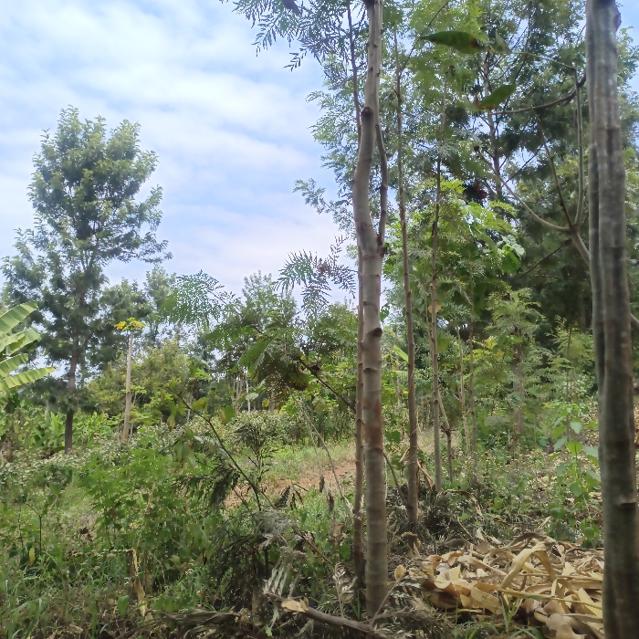 The image displays a daytime outdoor scene located in Mururi, Kenya, characterized by dense vegetation. The foreground exhibits uncultivated ground covered with green herbaceous growth, grasses, and scattered light brown organic debris, including what appears to be dried plant matter. Several slender, light grey to brown tree trunks and saplings with sparse green foliage rise vertically through the mid-ground. In the background, a cluster of taller, mature trees with full green canopies is prominent on the left, with additional green foliage extending across the frame. A portion of a large, green banana leaf is visible on the far left edge. The sky above is light blue with dispersed white clouds. No human subjects, animals, or man-made structures are present within the frame. The scene is static.
