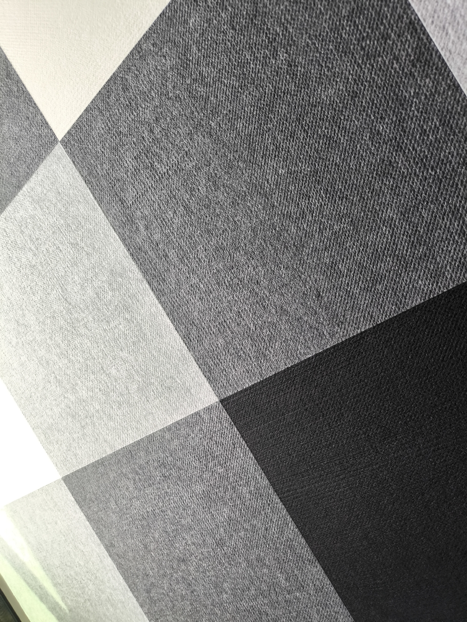 The image displays a close-up, angled view of a textile or patterned surface. It features a large-scale checkered pattern composed of square and diamond shapes in shades of white, light grey, medium grey, and black. The visible texture suggests a woven fabric or material with a distinct thread count, particularly apparent in the grey and black sections. The lines separating the color blocks run diagonally across the frame. A subtle greenish tint is present in the lower-left corner, suggesting a reflection. No people, specific objects beyond the patterned surface, actions, interactions, or identifiable environmental features are present. The location in the city of Riga, Latvia, cannot be determined from the visual information provided.