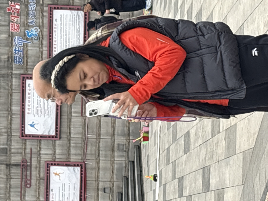 This image captures an outdoor scene in the city of Banan, China. In the foreground, an East Asian woman is prominently featured from the chest down. She has dark hair styled with a light-colored braided headband and wears a bright orange long-sleeved shirt, a black puffy vest (possibly Nike branded on the sleeve), and black athletic pants with a white Anta logo. She holds a white smartphone with a distinctive camera array vertically with both hands, looking down intently at its screen. A purple lanyard hangs from the phone. Behind her, an older East Asian man with balding hair and glasses is partially visible, positioned to her left and looking away from the camera. The background consists of a textured, light grey stone wall. Attached to this wall are two rectangular signs framed in dark red, containing Chinese text and illustrations: one depicts a running figure, and the other a basketball player. Above these signs, blue Chinese characters spell out "爱生活 从运动" (Love life, start from exercise). To the left of the frame, a series of stone steps ascends. On the patterned paved ground, a small green and black object rests on a white strip. Further back, near the base of the steps, a collection of colorful plastic buckets (pink, green, red, yellow) containing small implements such as shovels is visible. Additional indistinct figures are present in the far background. The ground is tiled with alternating light and dark grey rectangular pavers.