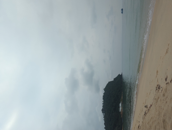A coastal scene under a cloudy sky. The right side shows a sandy beach with gentle waves touching the shore. The water transitions from light to darker shades. A green, hilly land mass juts out into the water near the center. A distant boat can be seen on the water's surface towards the upper right. The sky takes up the majority of the image, filled with gray clouds.