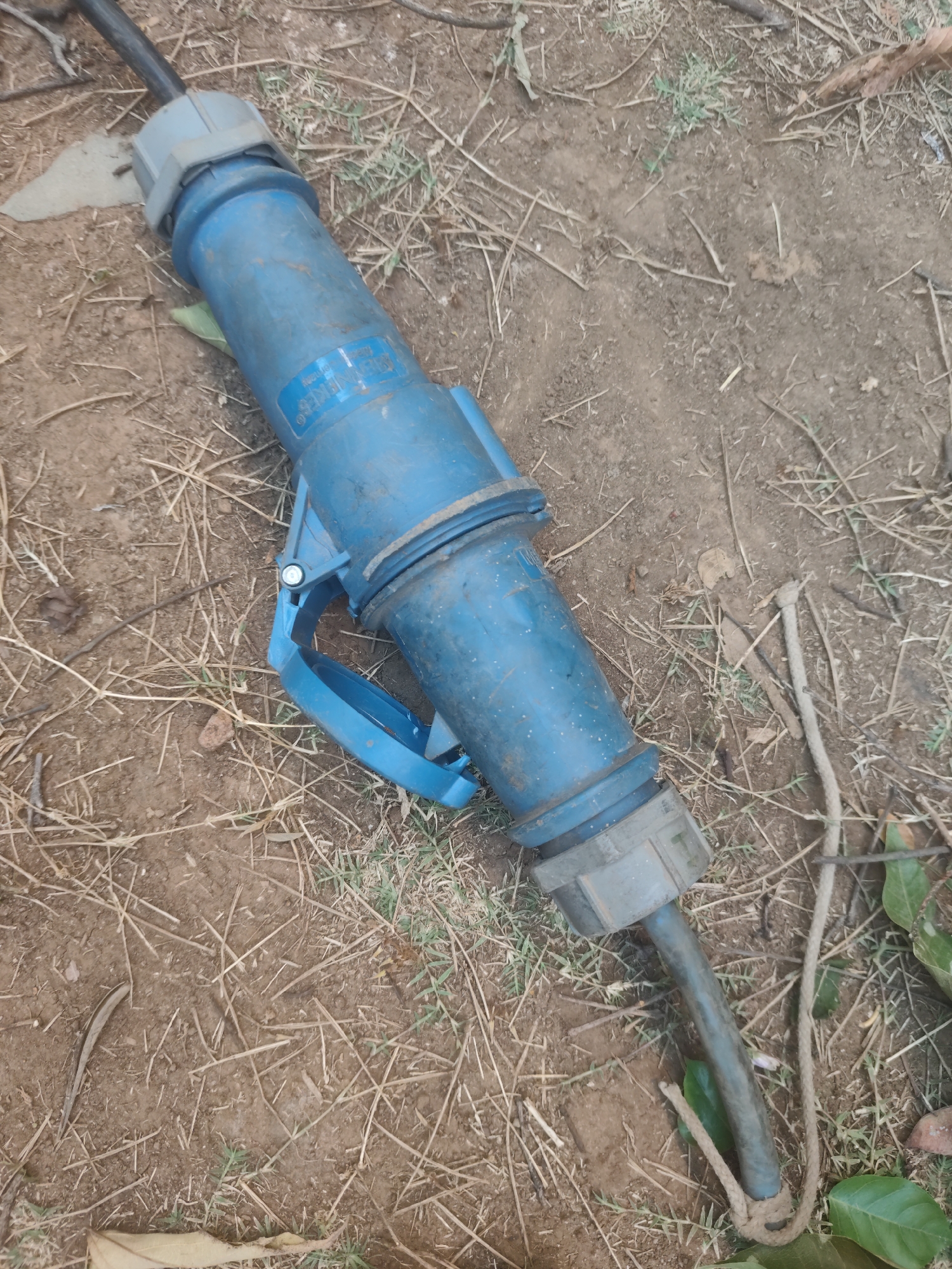 A blue industrial electrical connector and cable lay on the ground outdoors