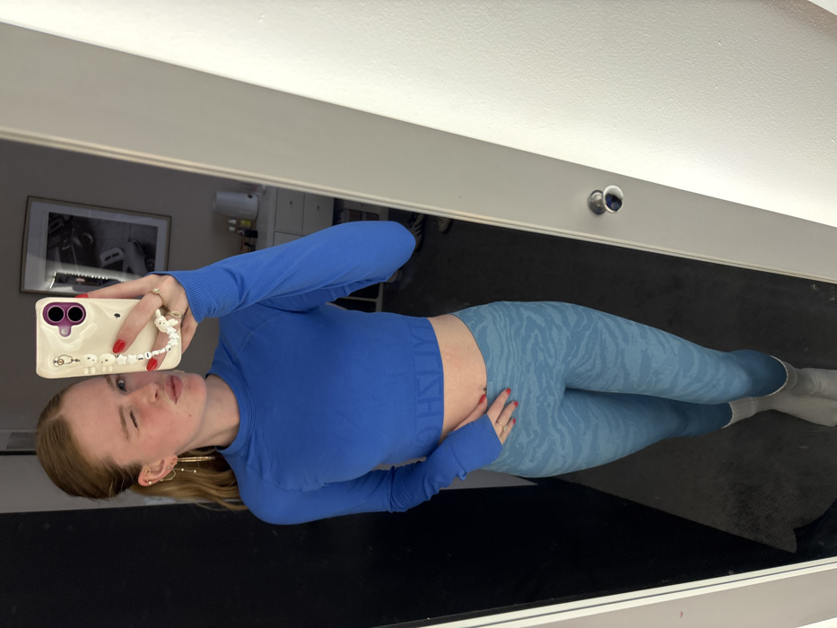 The scene is an indoor mirror selfie depicting a young, fair-skinned female with reddish-blonde hair tied back, located in Rosmalen, Netherlands. She is wearing a royal blue long-sleeved cropped athletic top displaying "GYMSHARK" branding on the lower band, light blue athletic leggings with a subtle pattern, and light-colored ankle socks. Her left hand holds a cream-colored smartphone with a purple camera module and a white beaded wrist strap, pointed towards the mirror to capture her reflection. Her fingernails are painted red, and she wears a ring on her left ring finger and multiple gold-colored earrings in her left ear. She is making a facial expression, winking with her right eye and pouting her lips. The background visible in the mirror's reflection includes a dark floor, a white dresser with various small containers, and a framed black and white photograph of a vehicle mounted on a light-colored wall. The mirror itself has a light-colored frame.