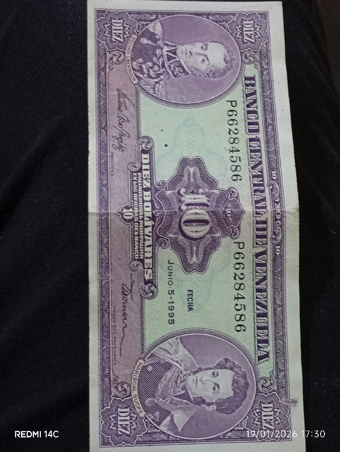 ten Bolivares banknote from Venezuela. The bill is dated June 5, 1995, and issued by the Banco Central de Venezuela. The serial number is P66284586. The note features portraits of Simon Bolivar and Mariscal Sucre, key figures in Venezuelan history. The denomination "DIEZ BOLÍVARES" is prominently displayed. The bill has a purple and light green color scheme.