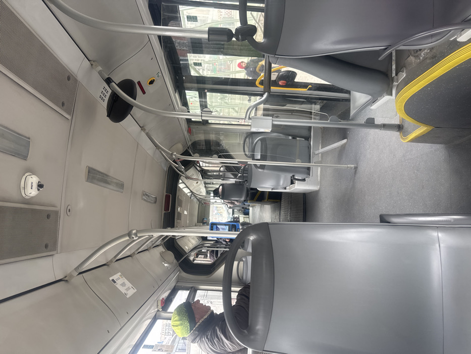 The image depicts the interior of a public transport vehicle, likely a bus or trolleybus, viewed from a passenger seat looking forward