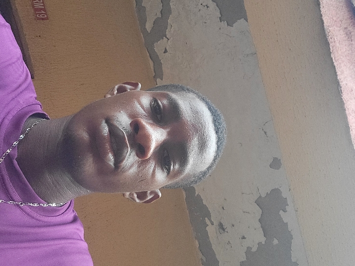 A close-up photo showcases a man in a purple shirt. A silver chain is visible around his neck. His dark skin glistens slightly. He looks directly into the camera with a serious expression. The background is textured with aged wall paint. A small red and white sign with the lettering "RM 19" is partially visible in the upper left corner. The image is slightly angled, creating a sense of casualness.