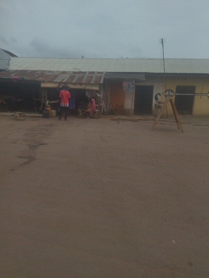 n empty, dirt street with a few buildings in the background. The street is dirty and dusty, with no people or cars present. The buildings are made of concrete and have corrugated metal roofs. One building has a sign advertising a product, possibly a brand of soft drink or a food item. The buildings appear to be part of a small market or shop. There are a few items left on the ground, perhaps remnants from the vendors who had been selling there. The image is taken on a cloudy day, and the overcast sky makes the scene appear dreary. The image is likely taken in Junction, Nigeria, based on the coordinates provided.
