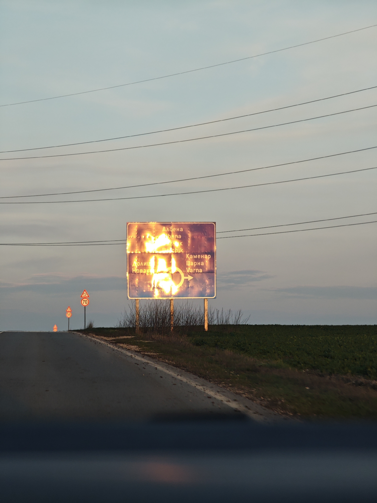 The image depicts a road leading into the city of Kamenar, Bulgaria. A large, rectangular, blue road sign displays place names in Cyrillic script. The sign lists Albena, Balchik, Dolishche, and Novaki on the left side, and Kamenar and Varna on the right, with an arrow pointing right next to Varna. The setting sun causes the sign to be brightly illuminated. Two speed limit signs, one reading "70" and another with "50", are seen along the roadside ahead. Power lines stretch horizontally across the upper portion of the image. To the right of the sign is a field with dark green vegetation. The image is taken from inside a vehicle, with a portion of the dashboard visible at the bottom. The sky is a gradient of light blue and pale orange, suggesting either sunrise or sunset.