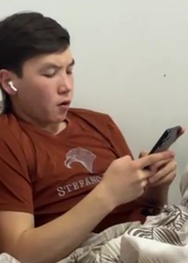 A young man lies in bed using his phone. He has short dark hair and is wearing a brown t-shirt with the word “STEFANO” printed on it. He has an AirPod in his left ear. The bed has a patterned duvet cover. The wall behind the bed is white. The man opens his mouth wide and makes faces as he interacts with his phone.