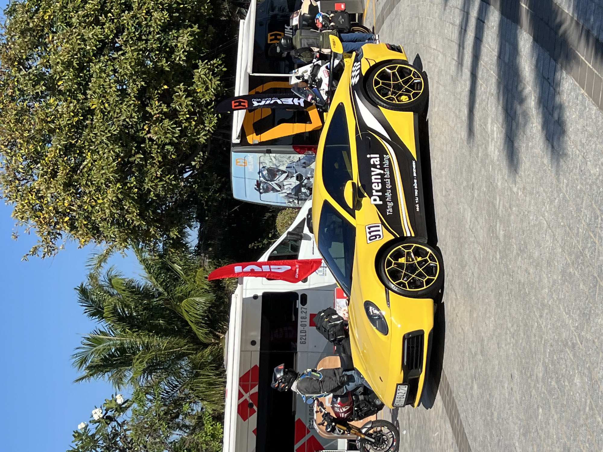 This outdoor scene, set in Cam Ranh, Vietnam, depicts a paved area with light gray square pavers under a clear blue sky, flanked by dense green foliage, including palm trees. Centrally positioned is a bright yellow Porsche sports car, model 911, distinguished by black and white graphic decals bearing "Preny.ai" and Vietnamese text "Tăng hiệu quả bán hàng." Its front license plate displays "51H-642.70," and its wheels feature black rims with yellow accents. To the left of the Porsche, an individual in a black motorcycle helmet with a dark visor, a black jacket, and blue jeans stands next to a red and black motorcycle. In the background, two white vans are parked. The left van shows "EXPLORE" branding and license number "62LD-018.27." The right van is branded "HEVIK" in yellow and black, featuring an image of two helmeted motorcyclists and appearing to be an open-sided support or display vehicle. Near the rear of this "HEVIK" van, another person in similar motorcycling attire is visible, alongside a partially obscured white motorcycle. A tall red flag bearing "GIVI" in white text and a black flag with "HEVIK" branding are present amongst the vehicles. Shadows from the vehicles and individuals are cast on the paved surface, consistent with overhead sunlight.