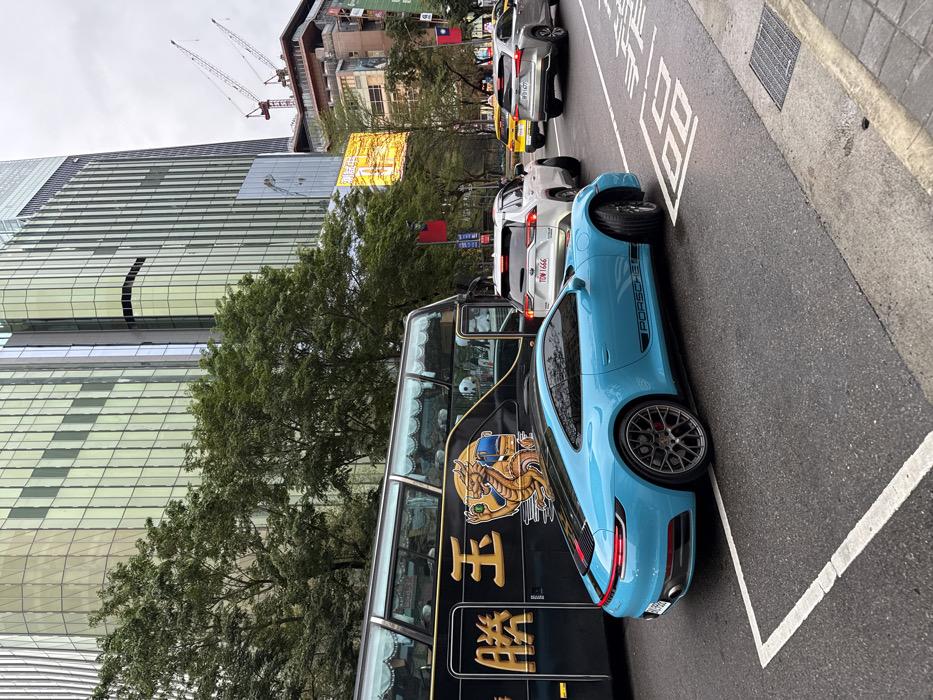 The image depicts an urban street scene in Taipei, Taiwan, likely within the Xinyi District. In the foreground, a bright blue Porsche 911 coupe (992 generation) with "PORSCHE" lettering on its lower side is positioned on a damp asphalt road, angled slightly towards the left. To the left of the Porsche, a large black touring coach displays a prominent gold dragon graphic holding a green orb, accompanied by Chinese characters '玉勝' (Yù Shèng) and '勝' (Shèng) on its side; indistinct figures are visible through its upper windows. Behind the Porsche, traffic progresses slowly in the same lane, featuring a white Toyota RAV4 SUV with license plate TDW-1666, followed by a silver Lexus RX SUV with license plate WD-1477, and a yellow taxi further back. White lane markings are visible on the wet road surface, with partially discernible Chinese characters (likely for "stop" or traffic instructions) painted on the right. A storm drain grate marks the edge of the sidewalk to the right. Lush green trees line the street to the left, partially obscuring the lower sections of tall, modern glass-facade skyscrapers, some featuring vertical green-tinted panels. In the mid-distance to the right, a construction site is active, indicated by two red and white tower cranes. A large, illuminated yellow digital billboard displaying Chinese characters is also visible, along with Taiwanese flags on poles further down the street. The sky is uniformly overcast.