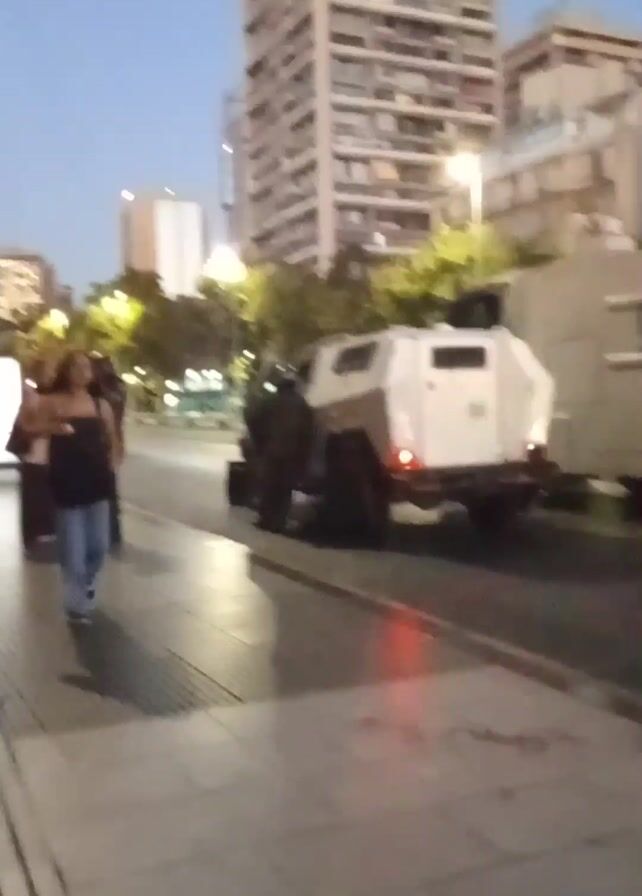 n urban scene on a sidewalk, likely in the evening or at dusk. There's a white armored vehicle, with the number "014" visible on it, parked on the street adjacent to the sidewalk. A person wearing protective gear stands near the vehicle. Several people walk on the sidewalk, including two women. The first woman wears a black tank top and light wash jeans, while the second wears a black top and blue jeans. A tall building and streetlights are in the background, indicating an urban setting.