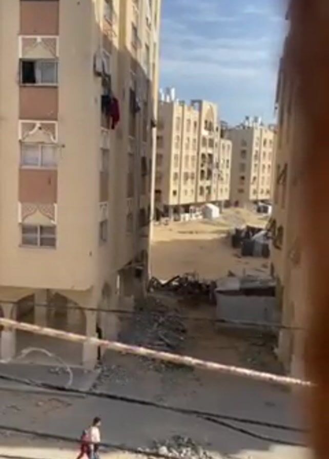 street scene, likely recorded from an elevated position, such as a balcony, overlooking a neighborhood of beige apartment buildings. Between the buildings is a large, open area with rubble and debris scattered across the ground. There are makeshift structures, possibly tents or temporary shelters, erected in the distance. A caution tape line stretches across the foreground. Several people are seen walking along the sidewalk below. One adult is seen walking with a small child. There are power lines visible running across the sky in the foreground. The sky is bright with some scattered clouds.