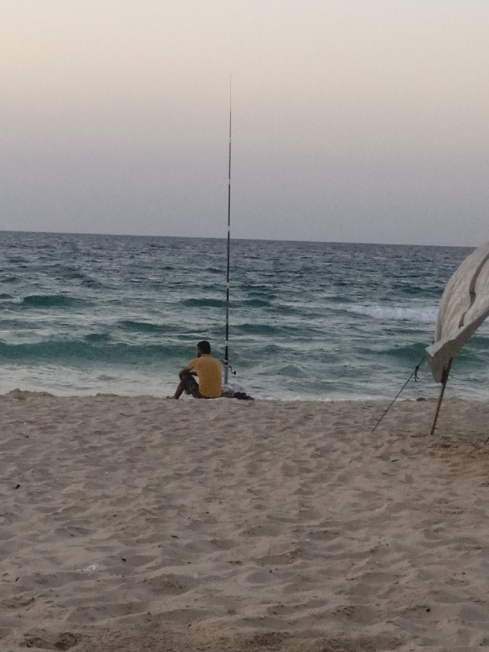 - "The image depicts a solitary individual engaged in fishing on the beach in Al-Mawasi, Palestinian Territories" by FM-cV3b62, licensed under CC BY 4.0