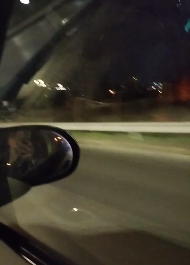 car driving at night. The view is from inside the car, looking out the side window and then the front windshield. The side mirror is visible in the side window shot. The car is driving on a road with a barrier on the side. The front windshield shot shows other cars and streetlights on the road ahead. A billboard is visible in the distance. The video is shaky.