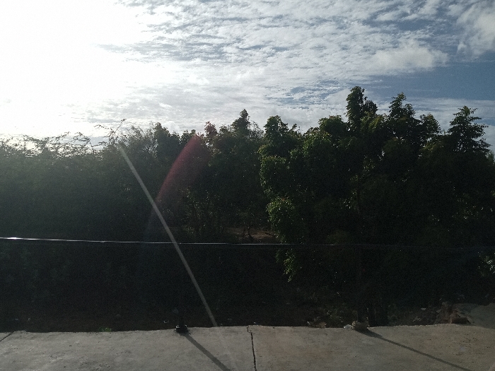 The image displays an outdoor natural landscape, stated to be located in Altagracia, Venezuela, under a partly cloudy sky. The foreground consists of a light gray concrete surface. A dark, horizontal bar, likely a railing, extends across the lower mid-ground, partially obscuring the view of the terrain immediately behind it. A small, dark cylindrical object, possibly a support post for the railing, is visible on the concrete in the lower foreground. Dense green foliage, comprising trees and shrubs of varying heights and densities, occupies the mid-ground and background. The left side of the sky and adjacent foliage is overexposed due to a bright light source, presumably the sun, which also generates a distinct diagonal lens flare extending from the upper left to the lower right. The sky on the right side shows blue patches with scattered white clouds. No people, animals, specific man-made structures beyond the concrete and railing, or observable actions are present within the frame.